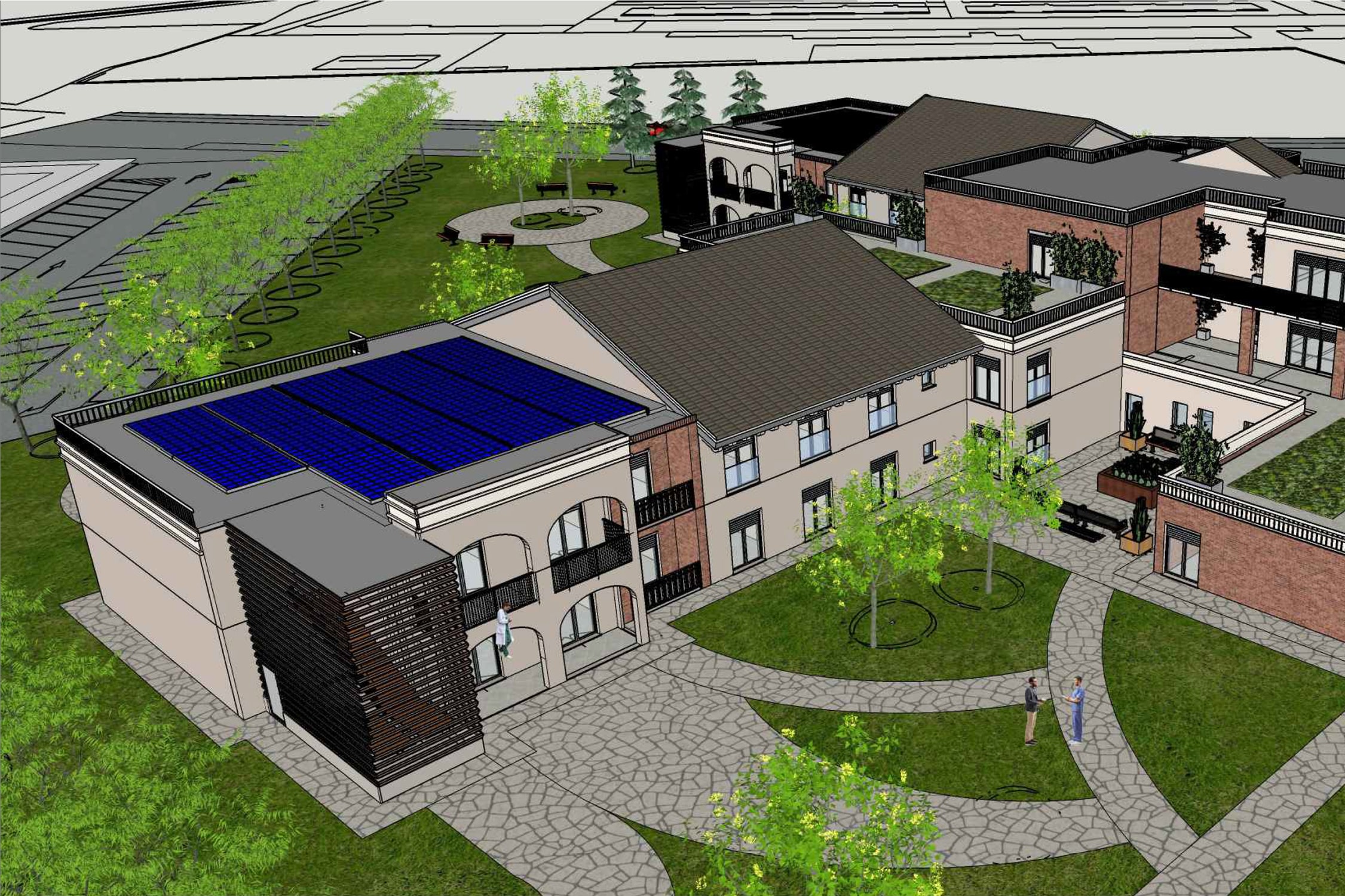 Il risultato è una residenza accogliente, organizzata e contemporanea, in cui la forma architettonica richiama simbolicamente movimento, apertura e vitalità, riflettendo la missione assistenziale e sociale della struttura.